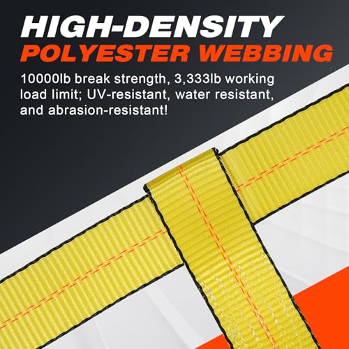 Las correas de remolque están hechas de poliéster de grado industrial para una máxima resistencia y durabilidad, ancho de correa de 2 pulgadas, resistencia a la rotura de 10,000 libras, límite de carga de trabajo de 3,333 libras; la correa de poliéster de grado industrial es impermeable y resistente a los rayos UV.