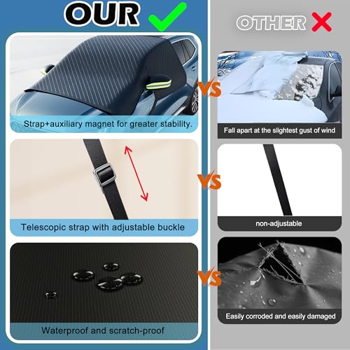 Fácil de instalar y almacenar: puedes poner y quitar fácilmente la cubierta del parabrisas de nieve para automóvil sin necesidad de herramientas ni ayudas. Las correas y la hebilla en la parte inferior de la cubierta del parabrisas del automóvil de invierno protegen la cubierta de tu automóvil en caso de viento fuerte. Esta funda para parabrisas para hielo y nieve viene con una bolsa de almacenamiento para un fácil transporte y almacenamiento.