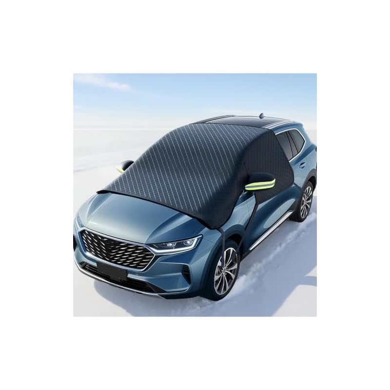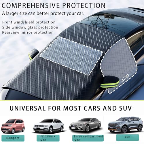 Cubierta para parabrisas de automóvil mejorada: esta cubierta para parabrisas para nieve mide 112 x 57 pulgadas. En comparación con las fundas de automóvil normales, nuestra cubierta de nieve mejorada para automóvil tiene una cobertura más grande, que puede proteger mejor el parabrisas, limpiaparabrisas, aerosol, espejo retrovisor, ventana delantera y manija delantera del automóvil.