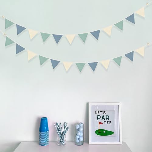 Guirnalda de guardería: Estas banderas triangulares de color verde salvia y azul son ideales para cualquier tipo de celebración, fiesta, festival, eventos u otra ocasión. Puede ser utilizado tanto por niños como por adultos. Como fiesta azul y verde, fiesta de niños, fiesta de golf, agujero en una fiesta, fiesta bohemia, despedida de soltera, baby shower, primera fiesta de cumpleaños, decoración de aula, boda, compromiso, graduación, bautizo, reuniones familiares, actividades al aire libre, fiesta de té, etc.