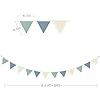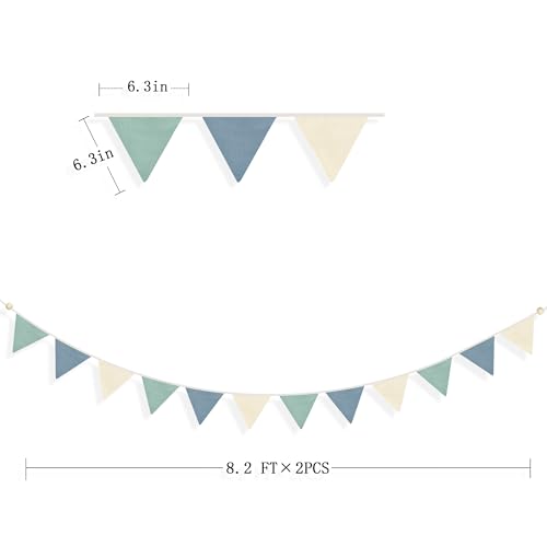 El paquete incluye: 2 guirnaldas de tela de lino de doble capa en colores verde salvia, azul y beige, 12 banderas de 8.2 pies cada una, el total es de 16.4 pies. Longitud lateral de la bandera: 6.3 pulgadas. Cada cuerda tiene dos pequeñas cuentas de madera ensartadas en el extremo.