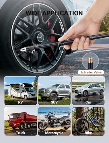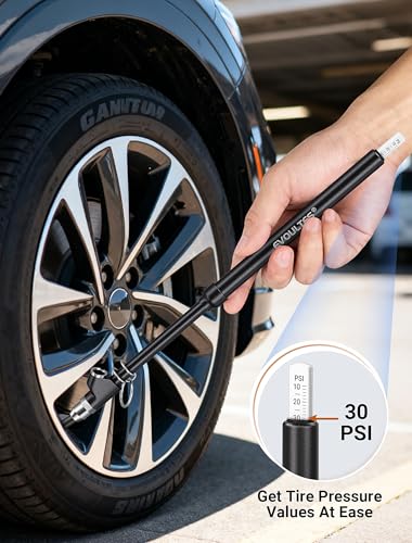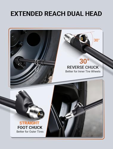 Diseño de doble cabezal extendido: manómetro de presión de neumáticos EVOULTES de 12 pulgadas de alta resistencia diseñado con mandril de aire de pie recto integrado y mandril de marcha atrás de 30°. Adecuado para ruedas dobles y otras válvulas de difícil acceso. También viene con 4 tapas de válvula adicionales para reemplazo, perfectas para comprobar la presión de tus neumáticos.