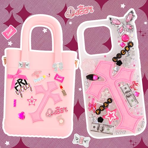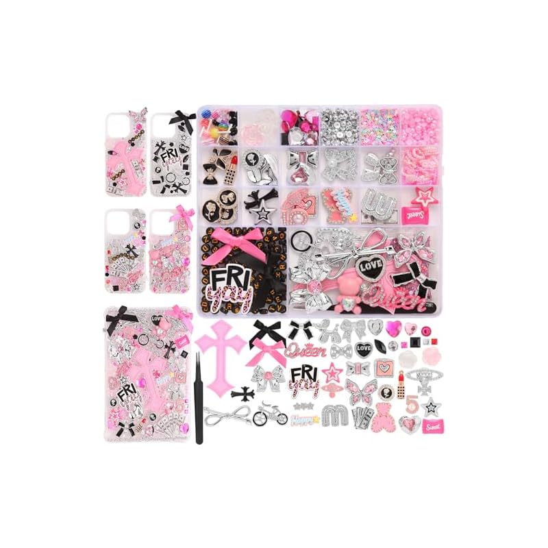 Junk Case Charms Kit: Contains 39 flat resin large charms, 1 flat resin large, 1 cross patch, 1 tweezers and a large number of flat pearls, rhinestones, black letter beads, glitter, star accessories, creating the ultimate DIY freedom.