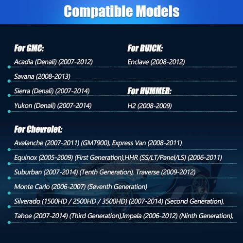 Modelos de coche aplicables: para Chevy Silverado 1500HD 2500HD 3500HD (2007-2013) (segunda generación); para Chevy Tahoe (2007-2014) (segunda generación); para Chevy Equinox (2005-2009) (primera generación); para Chevy Suburban (2007-2014) (2007-2011) 2) (Décimo Generación); Para Chevrolet Avalanche (2007-2013); Para Chevrolet Express Van (2008-2019); Para Chevrolet Impala (2006-2013); Para GMC Sierra (2007-2013); Para GMC Savana (2008-2019); Para GMC Yukon (2007-2014); Para GMC Ac. adia (2000) 7-2012); Para Buick Enclave (2008-2012)