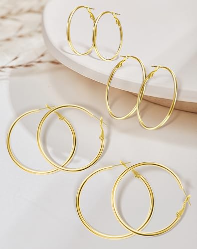 4 pares de aretes de aro de oro plateado para mujer de 30/40/50/2.362 in, acero inoxidable chapado en oro de 14 quilates, hipoalergénicos, grandes, finos y ligeros