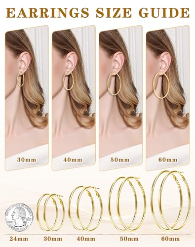 Especificaciones: 4 pares de aretes de aro de oro plateado para mujer de 30/40/50/2.362 in, acero inoxidable chapado en oro de 14 quilates, hipoalergénicos, grandes, finos y ligeros