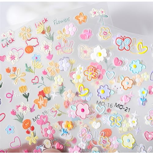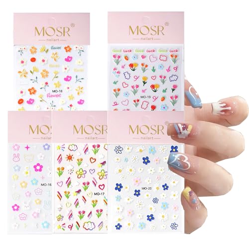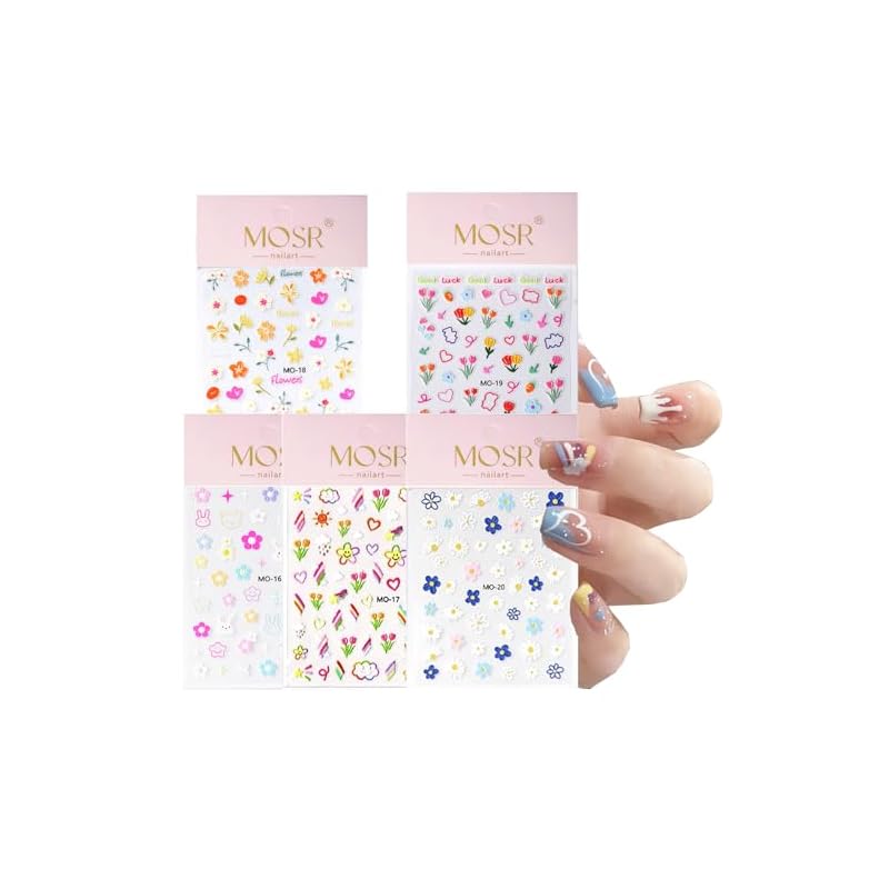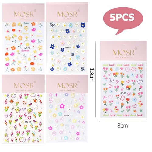 Especificaciones: 5 Hojas Pegatinas Para Uñas Flores, Autoadhesivas Nail Art Stickers Decoración, 3D Decoraciones para Uñas Tulipanes Flores Margarita Arcoiris