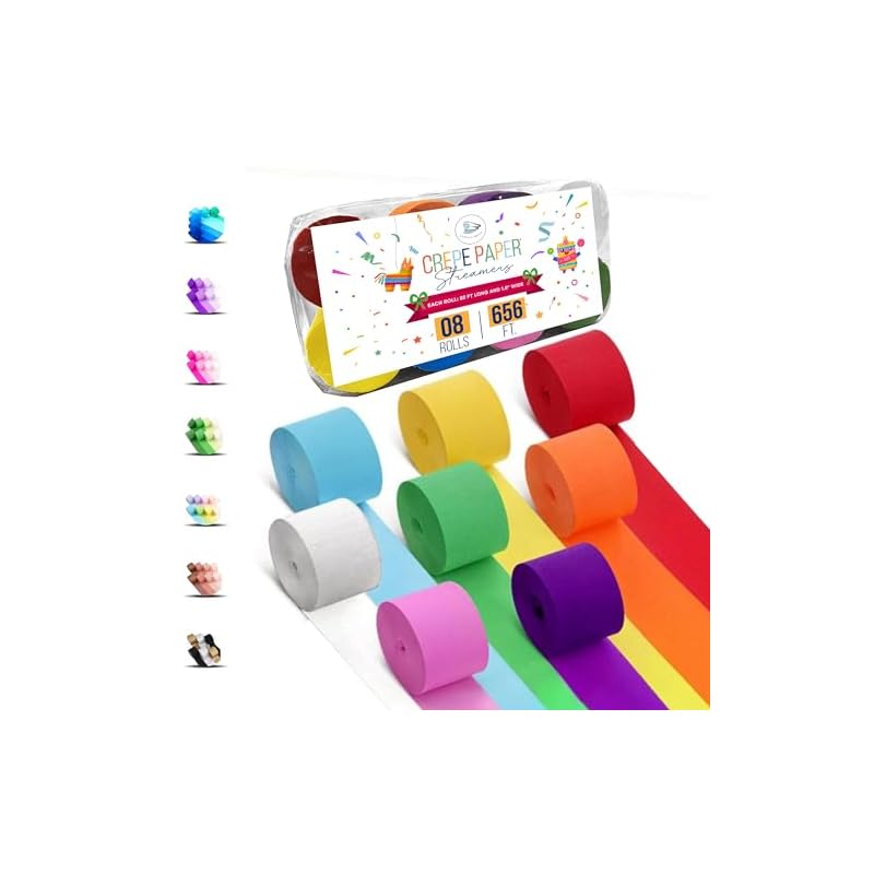 Multipack de serpentinas vibrantes: nuestro vibrante juego de 8 serpentinas de papel crepé, perfecto para cualquier decoración festiva. Incluye blanco puro, rosa suave, amarillo vibrante, verde brillante, azul cielo profundo, naranja vivo, rojo brillante y morado intenso. Cada rollo mide 1.8 pulgadas por 82 pies, asegurando una amplia cobertura para decoraciones de fiesta grandes.
