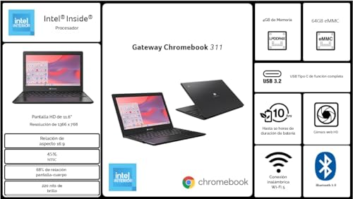 Puerta de enlace a la productividad: Mejore su productividad con el Gateway Chromebook 311: un Chromebook diario equipado con un procesador Intel rápido, una brillante pantalla antirreflejos HD de 11.6″ y alojada en un cuerpo ligero de 2.65 libras. Con la cámara HD y la rápida conectividad Wi-Fi, el Chromebook garantiza que te mantengas productivo durante todo el día. El Chromebook 311 de Gateway es delgado, ligero y ofrece un valor inigualable en el mundo actual impulsado por la tecnología. (NX.Y5RAA.002).