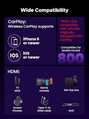 Notas de compatibilidad importantes: compatible con vehículos Apple CarPlay cableados de fábrica del año modelo 2016 y posteriores. (No compatible con los modelos BMW y Tesla). – Compatible con iPhone 6 o posterior con iOS 10 y superior para Wireless CarPlay. – Compatible con palos de TV, consolas de juegos, decodificadores, lanzadores de pantalla, DVD y más. – Su dispositivo de transmisión debe estar alimentado y requerir un punto de acceso móvil estable o conexión Wi-Fi para acceder a Internet. – Confirma la compatibilidad antes de comprar para garantizar un rendimiento óptimo.