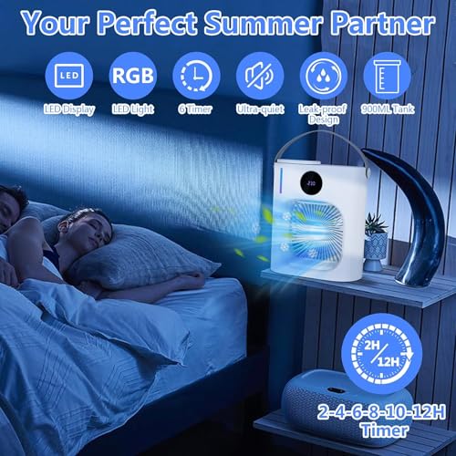 Aire Acondicionado Portatil,Mini Enfriador de Aire Silencioso 900ml Refrigerador de Aire con Temporizador, 3 Modos, 3 Velocità de Viento,Ventilador De Escritorio Para Oficina En Casa