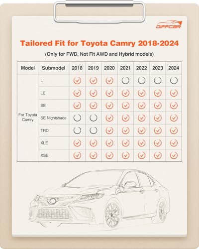 Ajuste personalizado para Toyota Camry 2018-2024: diseñado específicamente para modelos Camry FWD (tracción delantera) 2018 2019 2020 2021 2022 2023 2024. Estos tapetes delanteros y traseros de 3 piezas se ajustan a la medida para los modelos Toyota Camry LE, SE, SE Nightshade, XLE, XLE V6, XSE, XSE V6 y TRD. (Solo para FWD, no para AWD/Hybrid)
