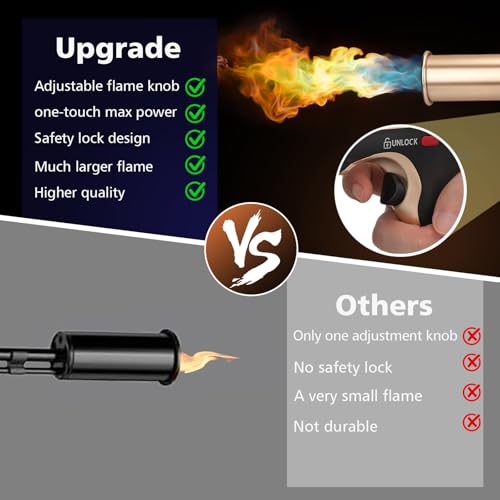 Fuego máximo de un solo toque: nuestro lanzallamas cuenta con un botón de calor máximo, lo que te permite alcanzar la temperatura más alta de 3272 °F con un solo toque. En comparación con otras linternas, esto ahorra tiempo y esfuerzo mientras mejora la eficiencia.
