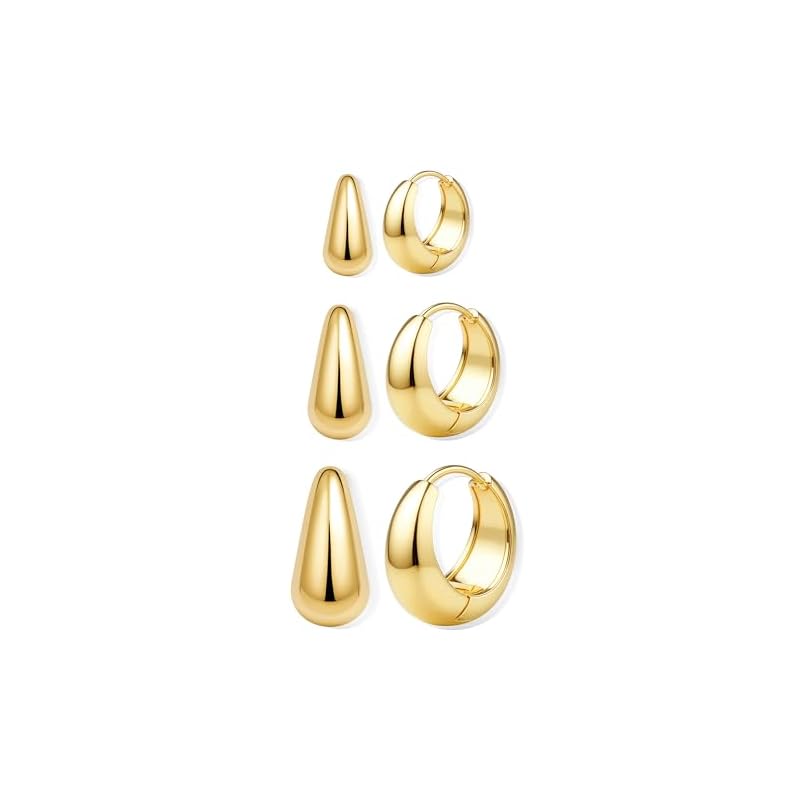 Especificaciones: BESTEEL Juego de 3 pares de aretes de aro chapados en oro de 14 quilates para mujer, aretes gruesos chapados en plata, hipoalergénicos, pequeños, ligeros, pequeños, gruesos, modernos para múltiples