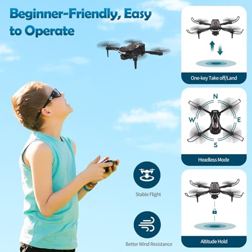 Ideal para Principiantes y Niños: Perfectamente adaptado para jugadores principiantes, este dron cuenta con un ‘Inicio con Un Botón’ fácil de usar que permite despegar rápidamente y sin esfuerzo. Mejorado con un sistema de vuelo estacionario sofisticado, mantiene una altitud estable, simplificando el control para los principiantes. Un diseño de luces divertido añade más emoción a la experiencia de vuelo