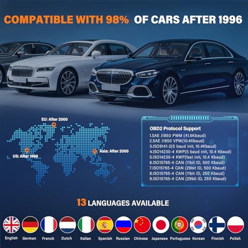 Amplia compatibilidad de vehículos y soporte multilingüe: esta herramienta de diagnóstico del escáner del coche OBD2 admite todos los protocolos OBDII, incluidos los protocolos KWP2000, J1850 VPW, ISO9141, J1850 PWM y CAN. Funciona con la mayoría de los autos estadounidenses de 1996 y más nuevos, 2000 automóviles de la UE y asiáticos, camiones ligeros, SUV y vehículos OBD2 y CAN más nuevos tanto en el país como en el extranjero. Este lector de código de error de automóvil admite 13 idiomas, incluidos inglés, alemán, francés, español, ruso y portugués, por lo que es una opción ideal para usuarios internacionales.
