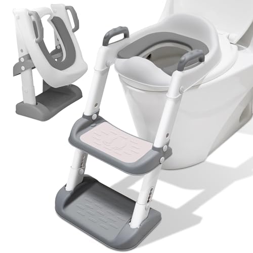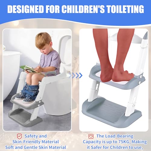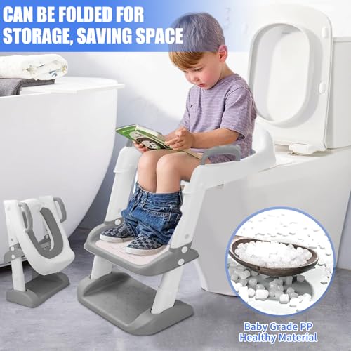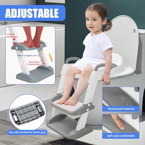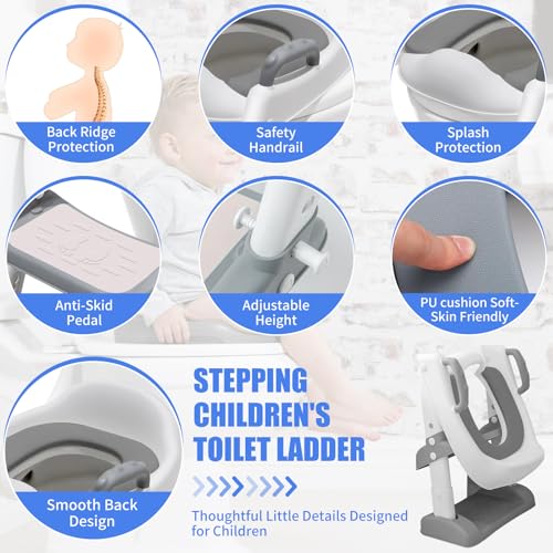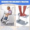 Asiento de inodoro para niños con escaleras fáciles de montar y almacenar, los pedales anchos antideslizantes son un cojín resistente y suave, el diseño mejorado del respaldo sostiene la espalda y proporciona a los niños reposabrazos de seguridad que se adaptan a la curvatura de los dedos del bebé.
