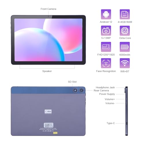 Especificaciones: C idea 2024 Tabletas Android 12, Tableta para Juegos de 10,1 Pulgadas, 8 GB de RAM, 128 GB de ROM, Espera Prolongada de 6000 mAh, WiFi 5G/2,4 G, Tableta de Escritura para Adultos y Adolescentes