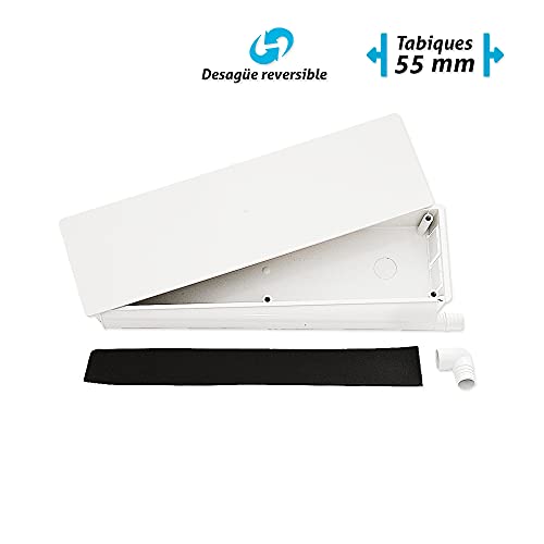 Caja de preinstalación con desagüe para empotrar ideal para tener preparada la instalación de aire acondicionado en la pared. Está fabricada en ABS de alta calidad y resistencia, con tapa blanca. Accesorio indispensable para tener la pre-instalación de aire acondicionado de una manera limpia y completa. Ofrece alta sencillez de aplicación y posibilidad de alojar los tubos de desagüe y cableado eléctrico.Su desagüe lateral de salida recta se puede direccionar tanto para derecha como para izquierda, permitiendo una mayor libertad a la hora de planificar, e incluye una salida de tubo en codo 90º de diámetro Ø20 mm.Dispone de cuatro salidas en los laterales de apertura sencilla, e incluye además una banda aislante de condensados adhesiva para colocar en la parte inferior del desagüe.Se empotra en tabiques de mínimo 55 mm de profundidad. Bandeja de desagüe Incluye codo 90° y banda aislante adhesiva Dimensiones: 392 x 134 x 55 mm