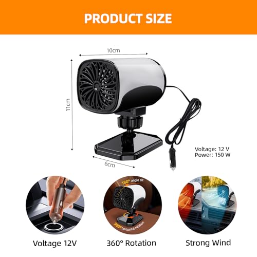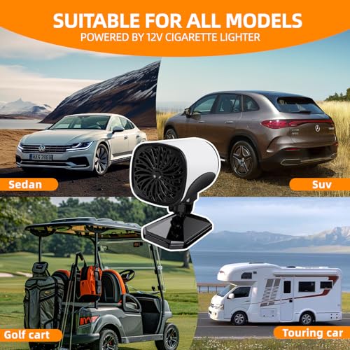 Amplia aplicación: consume poca energía, hace poco ruido y proporciona un flujo de aire fuerte y cómodo. El calentador de coche es adecuado para todos los modelos y vehículos equipados con un encendedor de cigarrillos de 12 V/24 V (furgonetas, maleteros, SUV, RVs, UTV, carrito de golf).