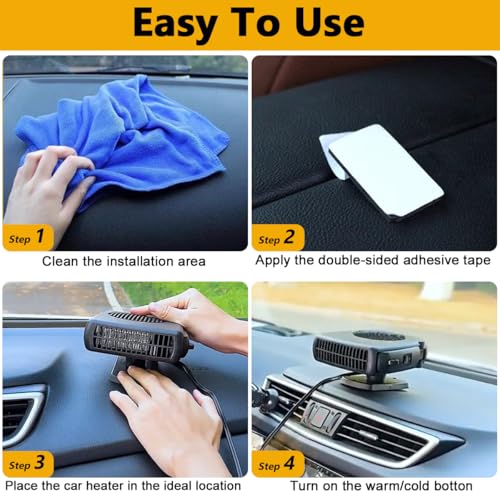 Fácil de instalar y usar: el descongelador portátil para el calentador de automóvil funciona con el puerto del encendedor de cigarrillos de 12 V y se puede insertar fácilmente a través del enchufe del encendedor de cigarrillos. Presione el ventilador o el interruptor de calor para comenzar a funcionar. La base está equipada con cinta adhesiva de doble cara. Puedes utilizar cinta adhesiva de doble cara para fijar el calentador de coche en la posición que desees.