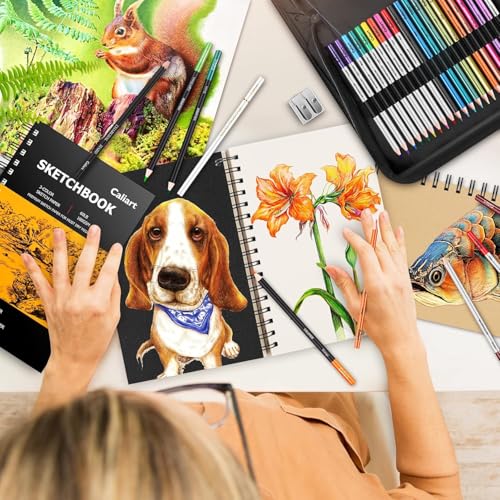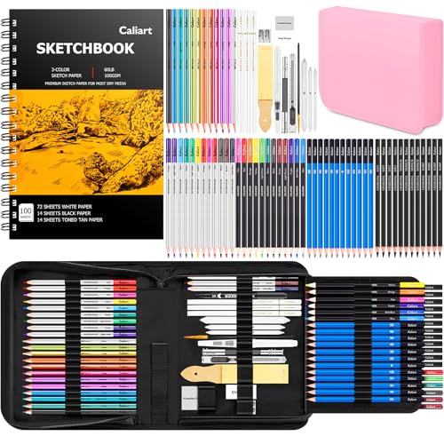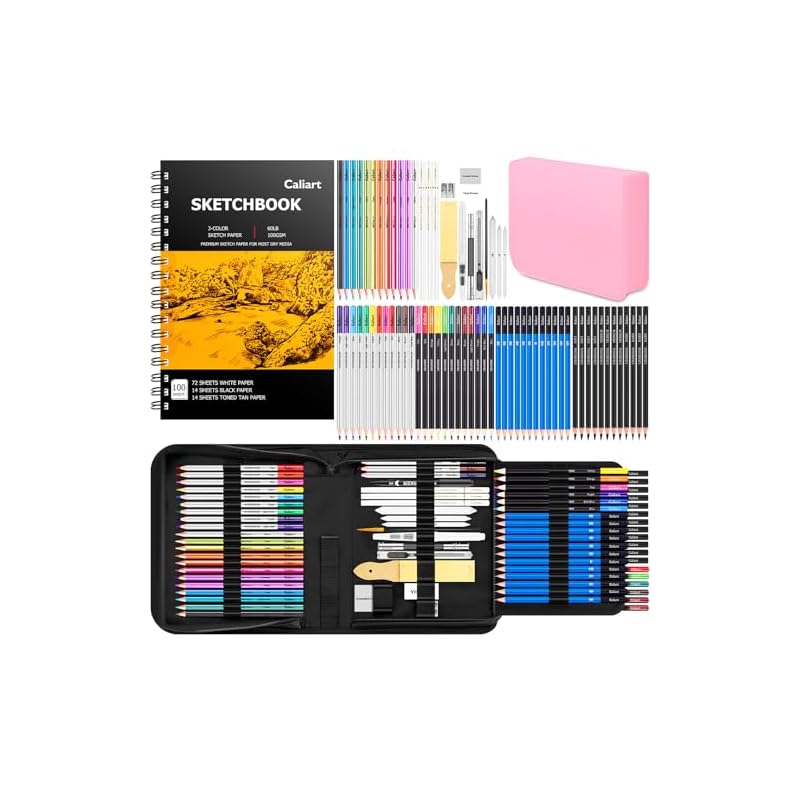 Caliart Kit de bocetos de 176 piezas de suministros de arte con 100 hojas de cuaderno de bocetos de 3 colores, acuarela de carbón de color grafito y lápices metálicos, suministros de dibujo, regalos