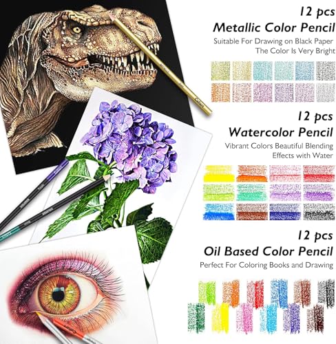 Kit de arte todo en uno: el juego de lápices de dibujo de alta calidad incluye 12 lápices de grafito, 12 lápices de colores, 12 lápices de acuarela, 12 lápices de carbón, 3 lápices de carbón blanco, 12 lápices metálicos, 3 tocones de papel de mezcla, bolígrafo de agua recargable, estuche de viaje y mucho más. Cada lápiz está marcado con nombre y número de color, y pre-afilado. 76 accesorios de herramientas de arte más un bloc de dibujo de 100 hojas, total de 176 piezas. Perfecto para dibujar, dibujar, sombrear, mezclar.