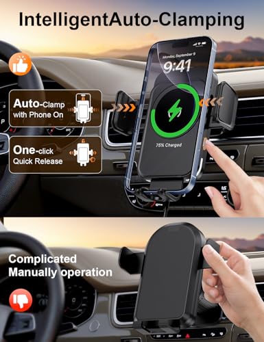 【Sujeción automática inteligente mejorada】Los brazos del cargador inalámbrico para automóvil se abrirán automáticamente después de conectarse a la alimentación, y se sujetarán automáticamente firmemente una vez que coloques tu teléfono, no es necesario ajustar manualmente para sujetar el teléfono. Liberar el teléfono es tan fácil como tocar un botón