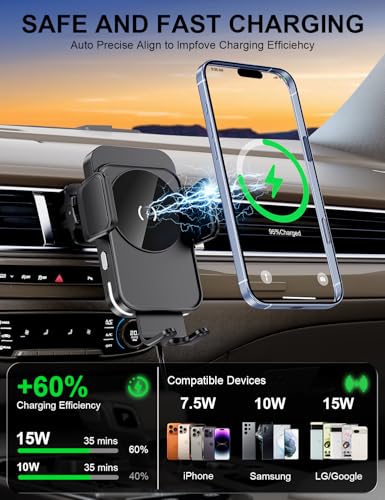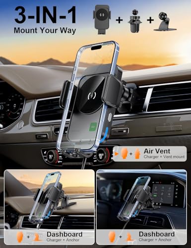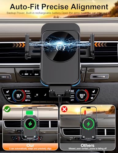 Especificaciones: Cargador inalámbrico para automóvil, carga rápida de 15 W [sujeción automática] [alineación automática] soportes de teléfono para tu salpicadero de automóvil, parabrisas, ventilación de aire