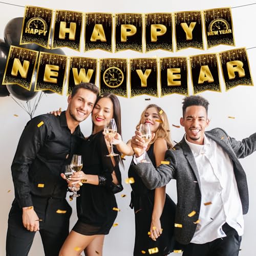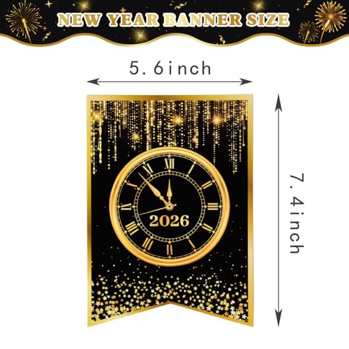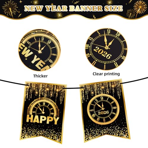 Especificaciones: Cartel de Feliz Año Nuevo 2026 – Decoraciones de fiesta de Año Nuevo negro dorado – Suministros reutilizables para fiesta de Año Nuevo 2026 (estilo G)