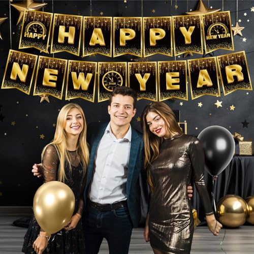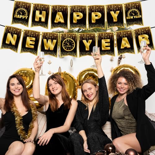 Elegante diseño negro y dorado: celebra con estilo con nuestra clásica pancarta negra con brillantes letras doradas. Este esquema de color atemporal añade un toque de lujo a tu fiesta de Nochevieja, decoración del hogar o fondo de fotos.