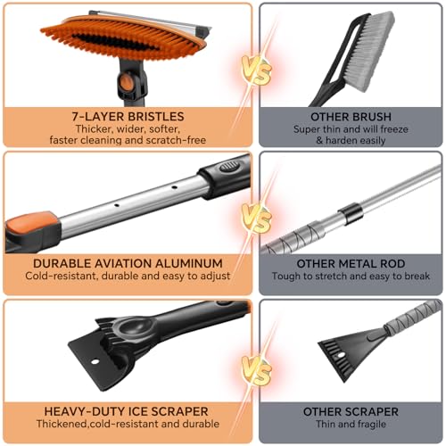 Mayor resistencia y comodidad: la varilla telescópica está hecha de un tubo de aluminio elíptico grueso, no es fácil de romper y doblar incluso para eliminar la nieve húmeda y pesada, y es una herramienta de limpieza de parabrisas que es resistente a bajas temperaturas. Diseñado para mayor comodidad, el mango de espuma EVA es suave, cálido y antideslizante, proporcionando un agarre constante. El material de cerdas de cepillo más grueso y ancho resiste el deshilachado y la deformación, manteniendo un rendimiento potente incluso después de un uso repetido. Cubre más área para obtener resultados más rápidos y limpios sin rayar tu parabrisas o pintura