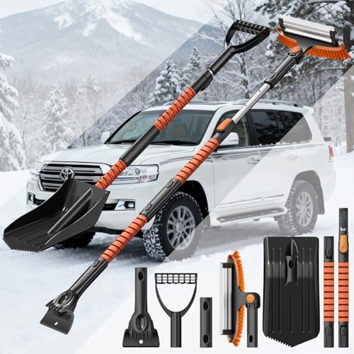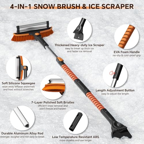 Cepillo de nieve 4 en 1 y raspadores de hielo para parabrisas de automóvil de 55 pulgadas, pala de nieve extensible, kit de escoba de nieve con escoba, agarre de espuma, cabezal de cepillo giratorio