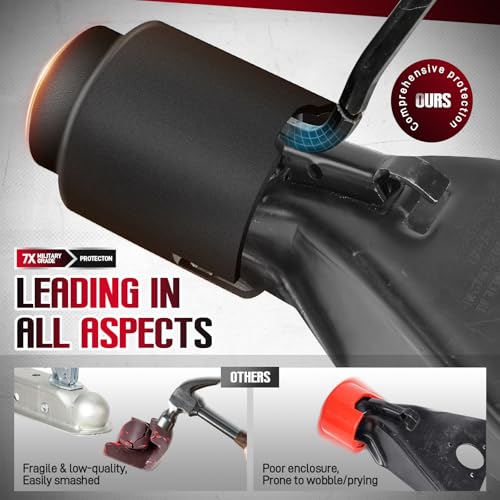 Resistencia al impacto: el bloqueo del acoplador de remolque está hecho de acero endurecido de cuerpo completo para una protección antirrobo confiable, resistente a daños externos. A diferencia de otros, el nuestro no se romperá incluso bajo fuertes golpes de martillo. Su diseño totalmente cerrado supera a los modelos de bloqueo de acoplamiento expuesto, y su ajuste apretado mejora el rendimiento anti-palanca, protegiendo completamente tu remolque y reduciendo el riesgo de robo.
