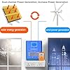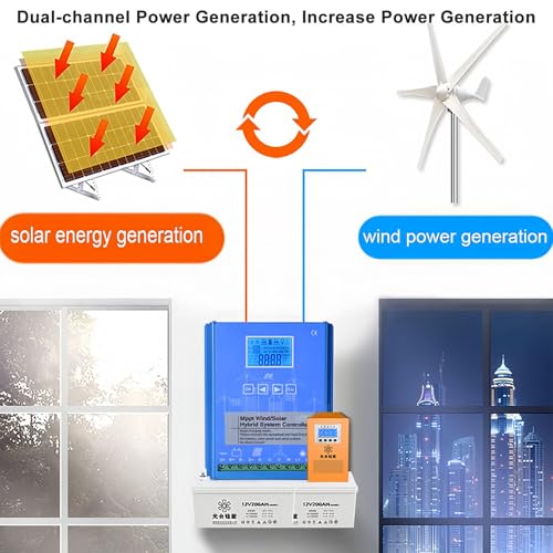 【Identificación automática de doble voltaje】Este controlador de carga híbrido está diseñado para voltaje dual (detección automática de 12 V/24 V, 24 V/48 V) y admite un máximo de 6000 W para generadores eólicos y 8000 W para paneles solares. El controlador eólico-solar complementario está diseñado para los sistemas de generación de energía eólica y solar, que integra el control de la energía eólica y solar.