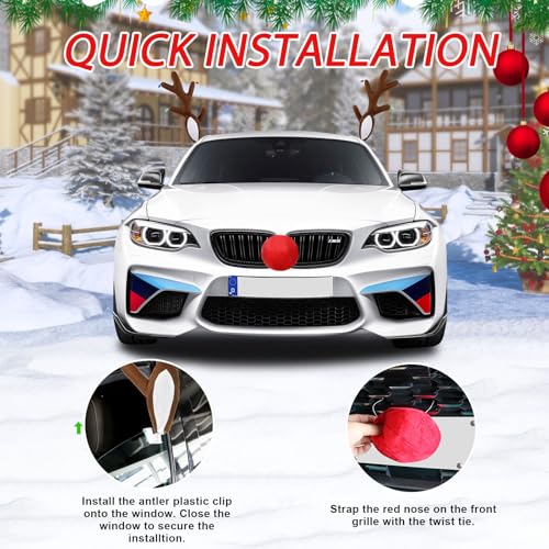 Fácil instalación con clip: simplemente enrolla la ventana de tu automóvil, conecta las astas de reno y luego enrolla para asegurarla. No se necesitan herramientas. La correa de nariz se ajusta perfectamente a la mayoría de las rejillas de los automóviles. Ajuste universal para automóviles, SUV y camiones