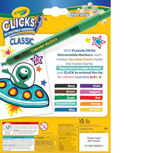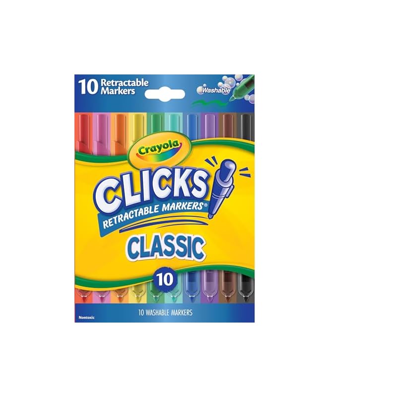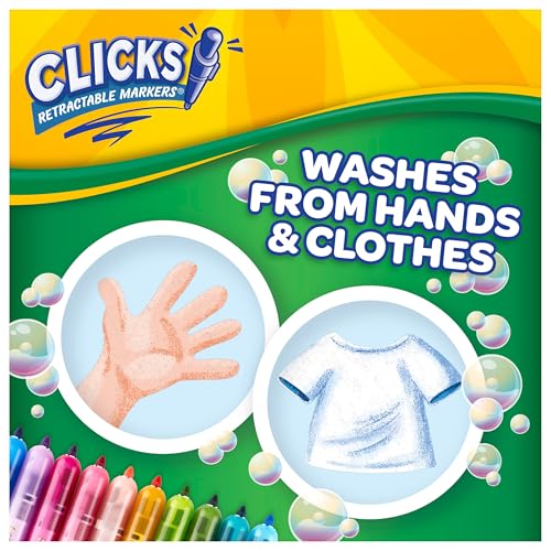 Especificaciones: Crayola Clicks Marcadores de punta retráctil (10 quilates), rellenos de calcetines para niños y niños pequeños, juego de marcadores de arte lavables con punta cónica, suministros para libros para
