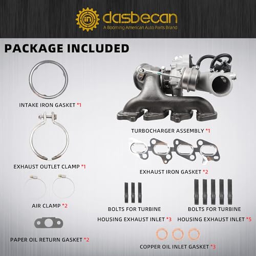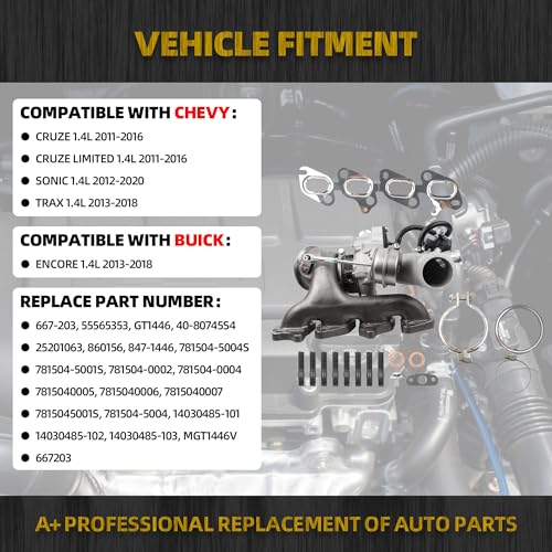 Especificaciones: Dasbecan Kit de cargador turbo compatible con Chevy Cruze Sonic Trax 1.4L 2011-2020, Buick Encore 1.4L 2013-2018, turbocompresor con junta de repuesto # 667-203 55565353 GT1446 781504-5004