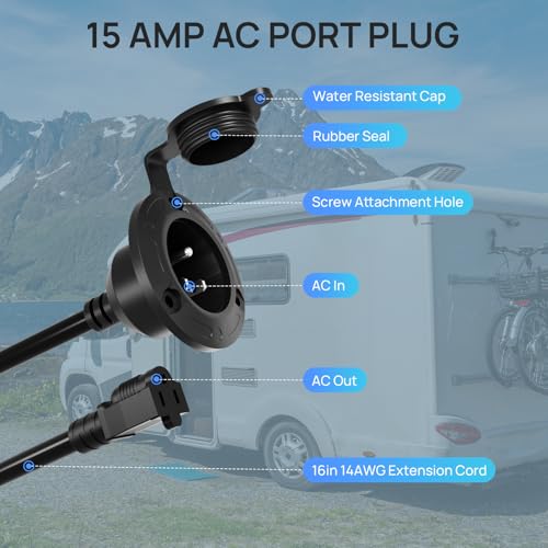 Rendimiento máximo: diseñado para mayor durabilidad y máximo flujo de potencia, este enchufe de entrada cuenta con una clasificación de 15 amperios y una construcción robusta con cable de cobre de 14 AWG. Ofrece una potencia consistente y de alto rendimiento para mantener sus vehículos y equipos funcionando eficientemente