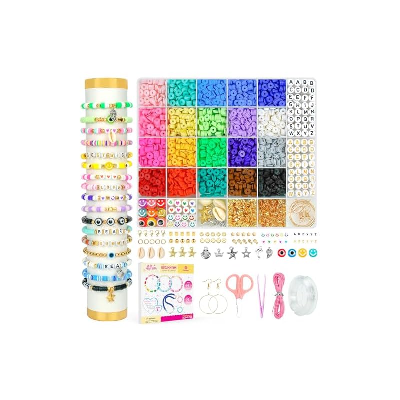 Especificaciones: Dowsabel Kit de fabricación de pulseras de cuentas de arcilla para principiantes, 5000 piezas de cuentas de arcilla polimérica con dijes para hacer joyas, manualidades y manualidades, regalos de