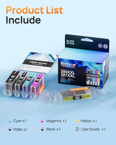 Contenido del paquete: Compatible con Canon tr8620a cartuchos de tinta incluyen 1 x grande negro PGI-280XXL, 1 x pequeño negro CLI-281XXL, 1 x Cyan CLI-281XXL, 1 x Magenta CLI-281XXL, 1 x Amarillo CLI-281XXL, paquete total de 5 (no incluye foto azul)