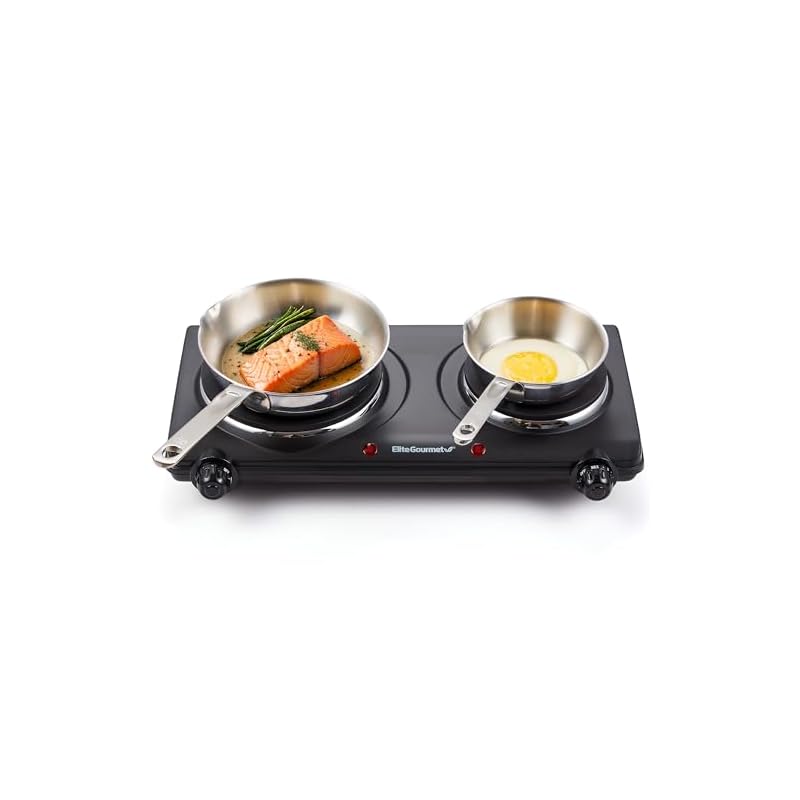 Especificaciones: Elite Gourmet EDB-302BF# Quemador de hierro fundido doble para encimera, placa eléctrica de 1500 vatios, controles de temperatura, luces indicadoras de alimentación, fácil de limpiar, negro