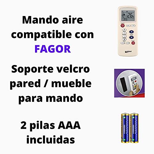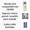 Especificaciones: FAGOR – Mando Aire Acondicionado FAGOR – *Soporte Velcro + Pilas Incluidas* – Mando a Distancia Compatible con Aire Acondicionado FAGOR. Entrega en 24-48 Horas. FAGOR MANDO COMPATIBLE.
