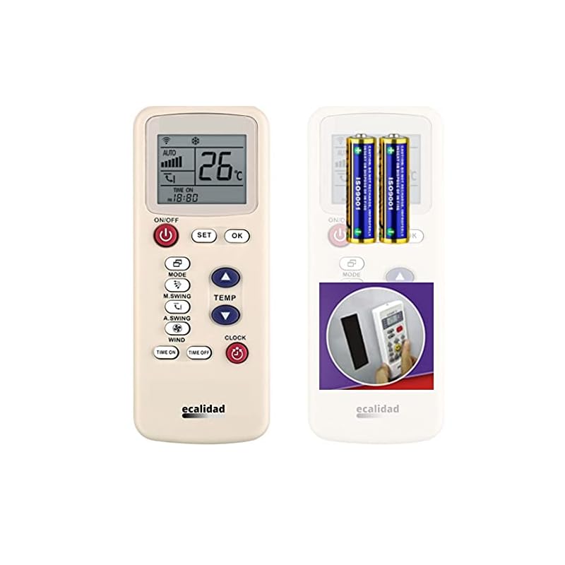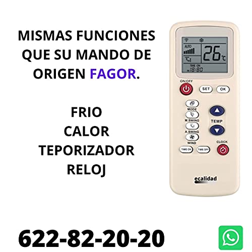 Mando a distancia compatible con aire acondicionado de la marca Fagor. Compatible con los aires acondicionados Fagor tipo split, esos que se cuelgan de la pared y producen frío y calor. No apto para dispositivos de conductos Fagor portátiles ni centralizados Fagor. Es necesario configurar el mando a distancia una vez recibido mediante un sistema de búsqueda automática. Excepto portátiles y ordenadores de techo. Función de búsqueda de patrones digitales programable. Con pantalla LCD. Fácil de manipular. Diseño compacto. Funciona con 2 pilas AAA incluidas. Mando a distancia de aire Fagor. Mando a distancia compatible con aire acondicionado Fagor.
