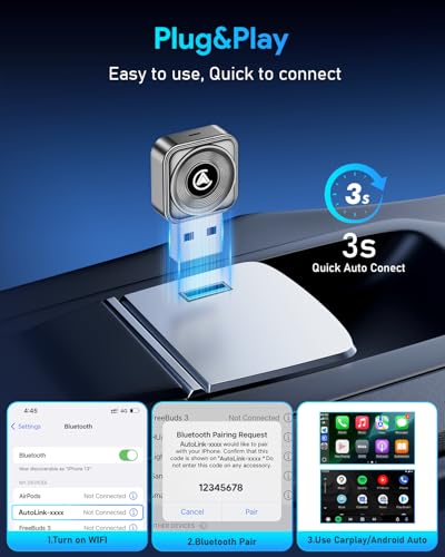 Diseño ultra mini, sin desorden en la cabina: el adaptador inalámbrico ultra mini mejorado para automóvil reduce el adaptador de juego de coche en un 60%. Tamaño de moneda, creando un espacio súper minimalista que incluso puede servir como decoración. Di adiós a los equipos voluminosos. Disfruta del puro placer de conducción: navegación, reproducción de música, llamadas telefónicas, asistente Siri, mensajes de texto, transmítelos a la interfaz de control del vehículo, proporcionando una conducción amigable y manos libres.
