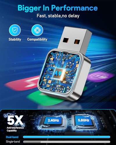 【 Chipset de doble banda, 200% salto de rendimiento】Los chips de doble frecuencia son como equipar tu automóvil con una «autopista de información de doble carril». La rápida transmisión de datos de navegación en la banda de frecuencia de 5.8 GHz garantiza un zoom suave de los mapas; la banda de frecuencia de 2.4 GHz transporta de forma estable llamadas de audio y duplica la capacidad antiinterferente del adaptador inalámbrico mini Apple Carplay. Al adoptar un enfoque dual, habrá cero retrasos en la navegación, sin retraso en la música y ninguna interrupción en las llamadas, haciendo que cada viaje sea suave y sin problemas.