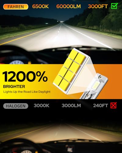 Especificaciones: FAHREN Bombillas antiniebla H11/H8/H9, brillo de 50000 lúmenes, blanco frío 6500K, Plug and Play, tamaño halógeno 1:1, impermeable IP68, paquete de 2