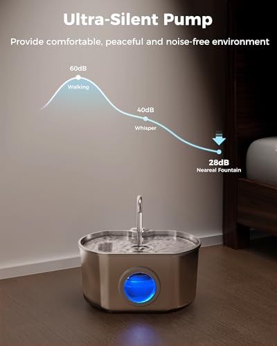Bomba ultra silenciosa de 5 V: diseñada para la comodidad de tu mascota, la fuente para mascotas cuenta con una bomba ultra silenciosa de 5 V que funciona a un suave ≤ 28 dB, lo que permite a tu amigo peludo disfrutar de una bebida pacífica sin ninguna molestia; ten la seguridad de que tu mascota no se sorprenderá por ruidos fuertes y puedes mantener su rutina diaria sin molestias; además, su diseño eficiente garantiza un consumo mínimo de energía