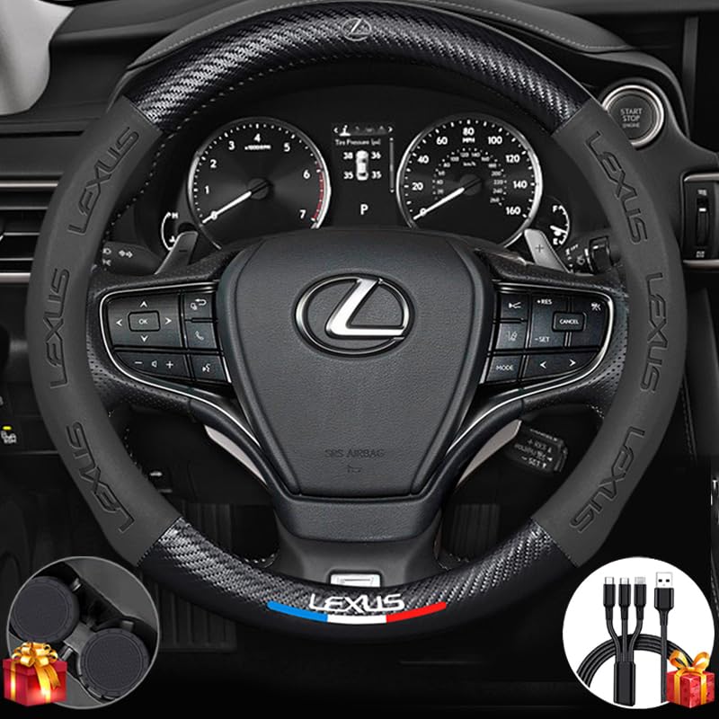 Funda para volante compatible con Lexus, funda de volante de cuero Napaa premium y textura de fibra de carbono, con 2 posavasos universales y cable de carga rápida USB (negro)