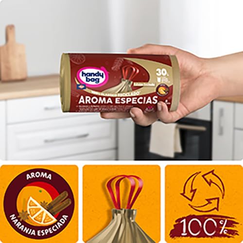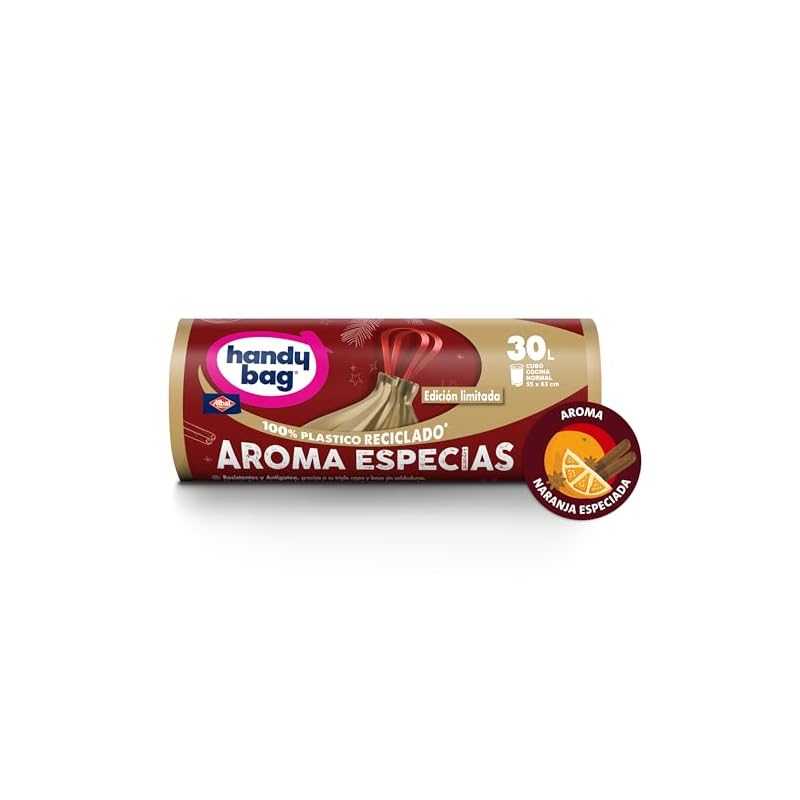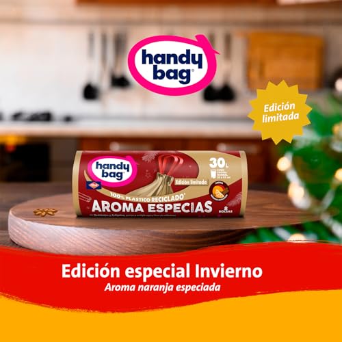 Especificaciones: Handy Bag Bolsas de Basura Aroma Especias, 100% Reciclado, Extra Resistentes, Antigoteo, Autocierre, 30L, 8 Bolsas, 1 Paquete